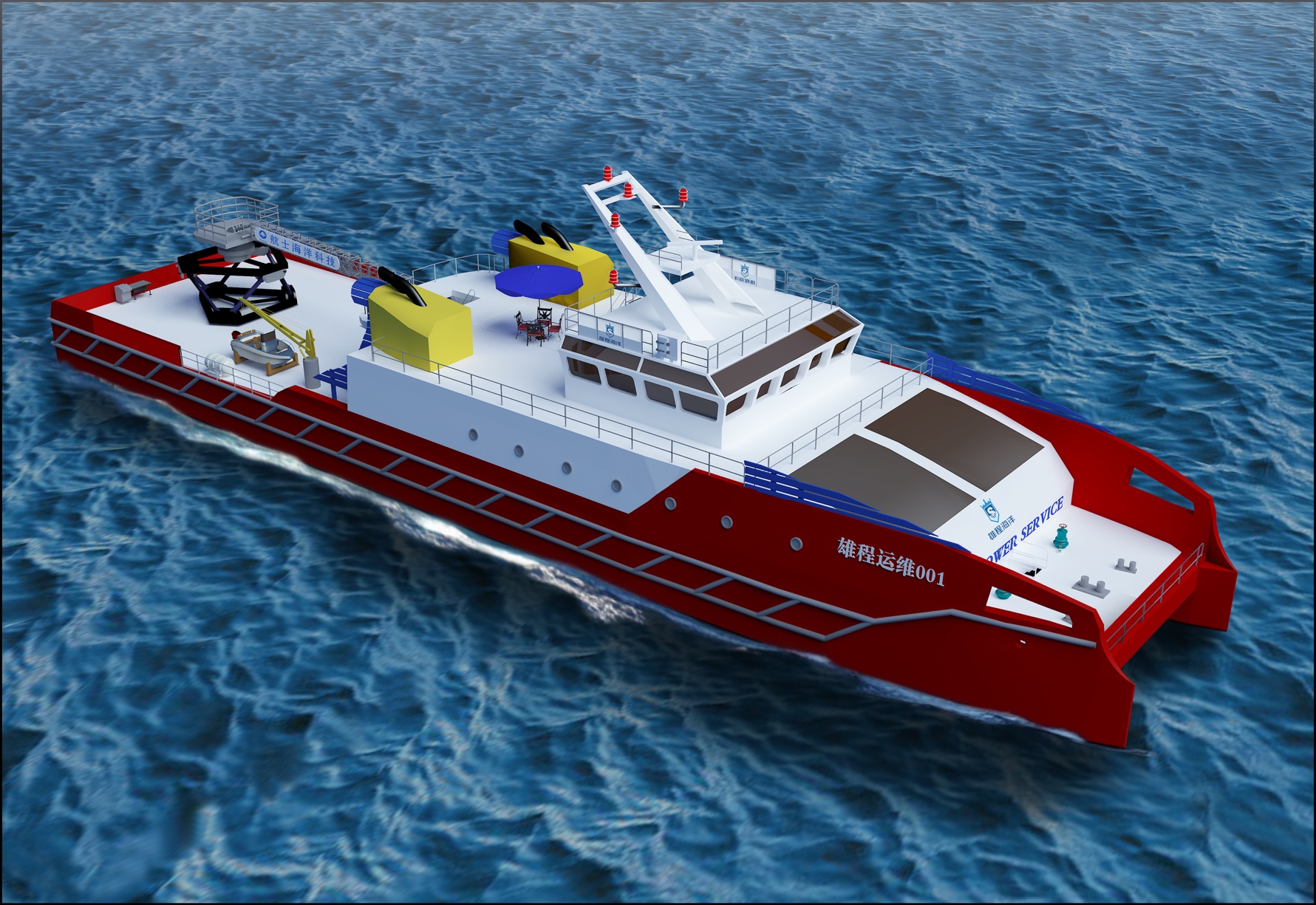 此艘50M風電運維船設(shè)計為雙體船總長49.9米,排水量約600噸,將是目前國內(nèi)先進的創(chuàng)新型風電運維船,雙舵槳主推,雙艏側(cè)推,配備六自由度波浪補償?shù)浅讼到y(tǒng)、直流組網(wǎng)電力推進系統(tǒng)和DP-2動力定位系統(tǒng),擁有能在4級風海況下進行登乘作業(yè)的能力,穩(wěn)性滿足抗8級風的能力,核心設(shè)備實現(xiàn)國產(chǎn)化。