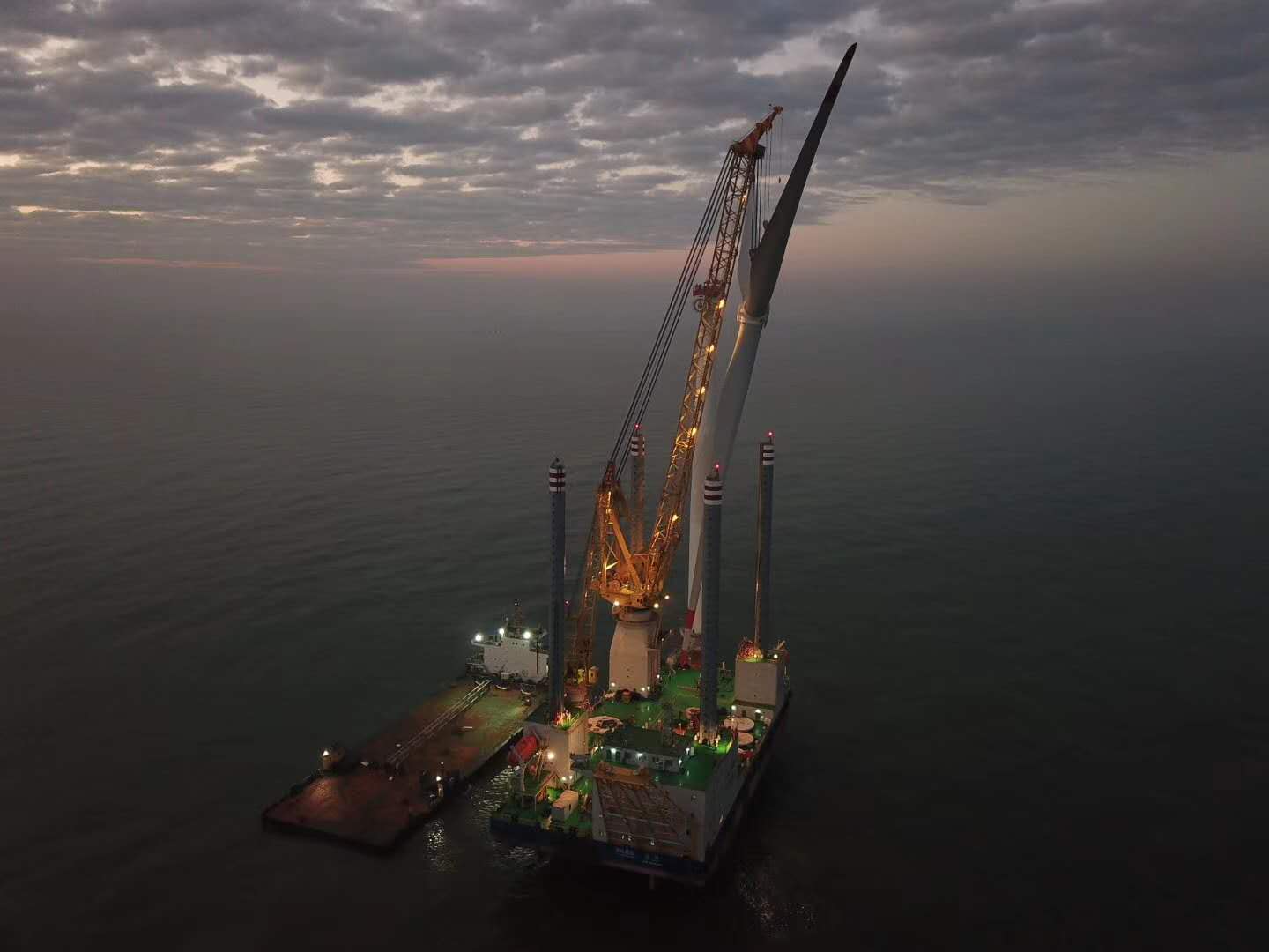 一航亨通海上風(fēng)電作業(yè)平臺(tái)總長120.5米,型寬38米,型深6.8米,是集“風(fēng)電基礎(chǔ)施工、風(fēng)電塔筒、塔架、機(jī)艙、輪轂、葉片”安裝與維護(hù)為一體的風(fēng)電作業(yè)平臺(tái)。該平臺(tái)艏部設(shè)有2臺(tái)600kW、艉部設(shè)有2臺(tái)1300kW的全回轉(zhuǎn)舵槳,用于海上風(fēng)電場包括基座安裝、塔架、機(jī)艙以及葉片吊裝等施工作業(yè)。