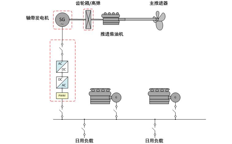 • 軸帶電機(jī)和推進(jìn)主機(jī)通過(guò)機(jī)械方式連接;
