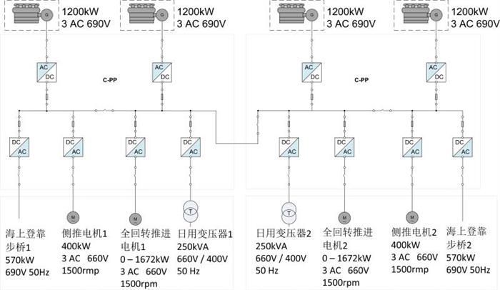 該項目由無錫賽思億電氣科技有限公司提供的全船直流組網(wǎng)變頻電控系統(tǒng)動力總成,供貨范圍包括:直流組網(wǎng)變頻電控系統(tǒng)、柴油發(fā)電機組、舵槳系統(tǒng)、動力定位系統(tǒng)(DP-2)、配電板及機艙檢測報警系統(tǒng)等設(shè)備,順利通過了首次海試任務(wù),完全符合船東的技術(shù)要求,滿足本船的使用條件,獲得了船東、船廠及設(shè)計院的高度的贊賞。直流組網(wǎng)技術(shù)在“雄程天威1”號上的應(yīng)用,不僅解決了雙體船機艙空間小的問題,還可充分滿足在風(fēng)場惡劣海況下對船舶動力定位(DP-2)、登乘系統(tǒng)的高動態(tài)響應(yīng)能力的技術(shù)要求,進(jìn)一步提升了船舶的動態(tài)響應(yīng)特性。