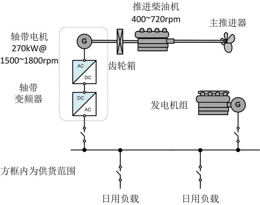 6000DWT瀝青船,采用賽思億S-Hybrid混合動力系統(tǒng),具有穩(wěn)定可靠、電源品質高、性價比高等優(yōu)勢,相比于全電力推進系統(tǒng),初始投資小,在不改變船舶原有主機動力形式的前提下,充分利用船舶在遠洋航線的經濟航速工況,系統(tǒng)通過主機冗余功率帶動異步電機發(fā)電運行,在提高主機負荷率改善其油耗的同時,可以關停船舶輔機,節(jié)省了船舶的運營油耗。