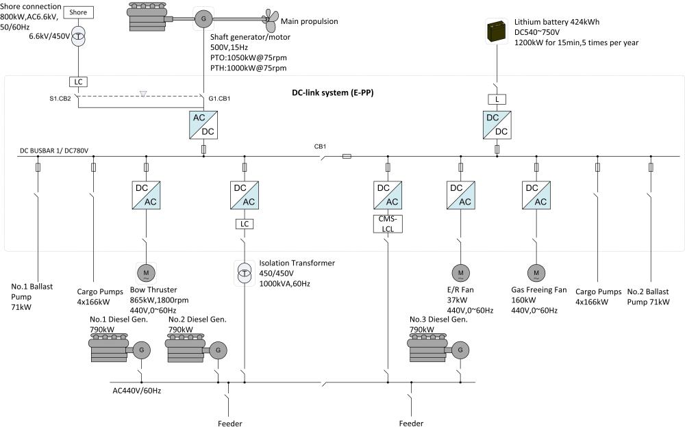 鼎衡15000噸化學(xué)品船,船舶總長(zhǎng)147米,型寬22米,入級(jí)BV船級(jí)社,抱軸電機(jī)額定功率為1000kW,同時(shí)配置424kWh電池達(dá)到削峰填谷的目的,該船舶混合動(dòng)力系統(tǒng)采用直流組網(wǎng)形式,將主機(jī)、發(fā)電機(jī)組、電池動(dòng)力整合并高效分配,為用戶(hù)提供高效、綠色、可靠的混合動(dòng)力。將于2021年年初完成安裝調(diào)試。
