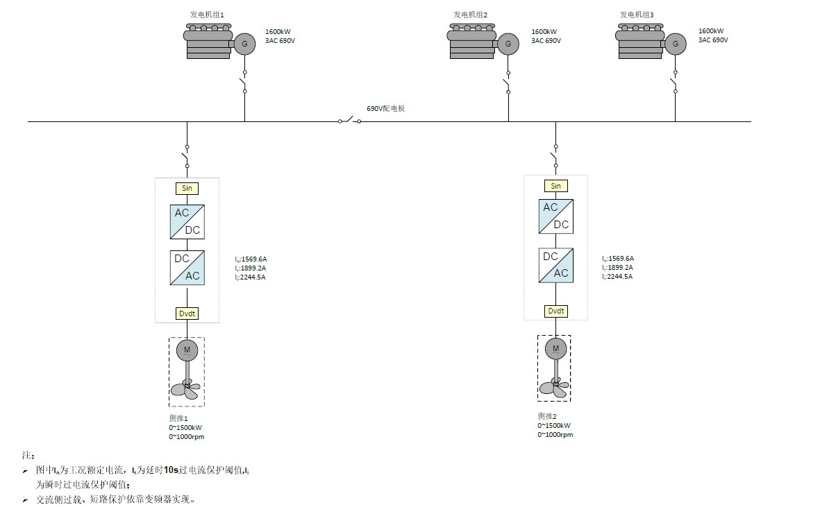 新韓通2400T起重船,該船船長181.58m,型寬48m,型深13m,為2400T起重船,整個系統(tǒng)配置3臺1600kW發(fā)電機(jī)組,2套1500kW變頻器,驅(qū)動2套1500kW側(cè)推槳。